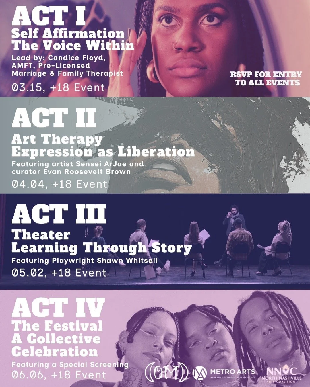 A four part series unfolding from March-June 2026 where we creatively bring the Nashville community together to dive into mental wellness. We explore affirmations and positive self talk, improv theater and more!